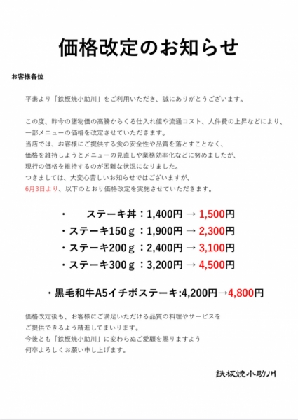 ランチ営業の価格改定のお知らせです。ご理解の程よろしくお願いいたします。原材料価格の⾼騰、運送費...